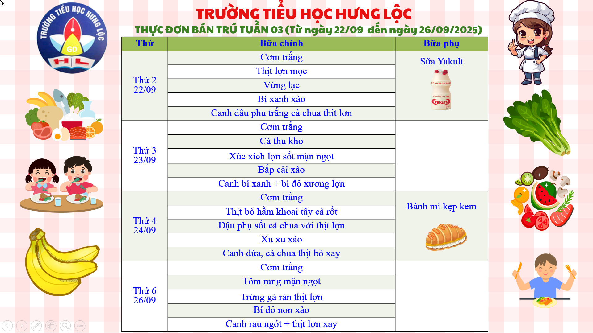 THỰC ĐƠN CỦA TRƯỜNG TIỂU HỌC HƯNG LỘC TUẦN 03 NĂM HỌC 2025-2026