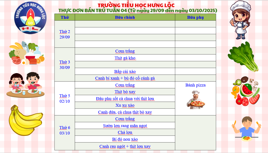 THỰC ĐƠN CỦA TRƯỜNG TIỂU HỌC HƯNG LỘC TUẦN 04 NĂM HỌC 2025-2026