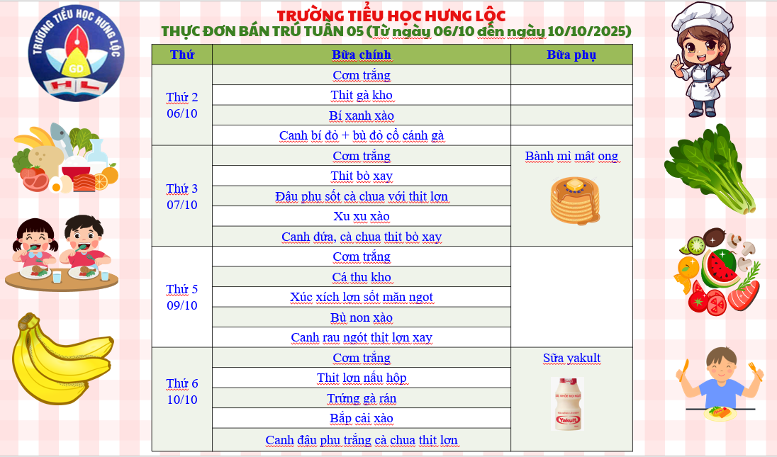 THỰC ĐƠN CỦA TRƯỜNG TIỂU HỌC HƯNG LỘC TUẦN 05 NĂM HỌC 2025-2026