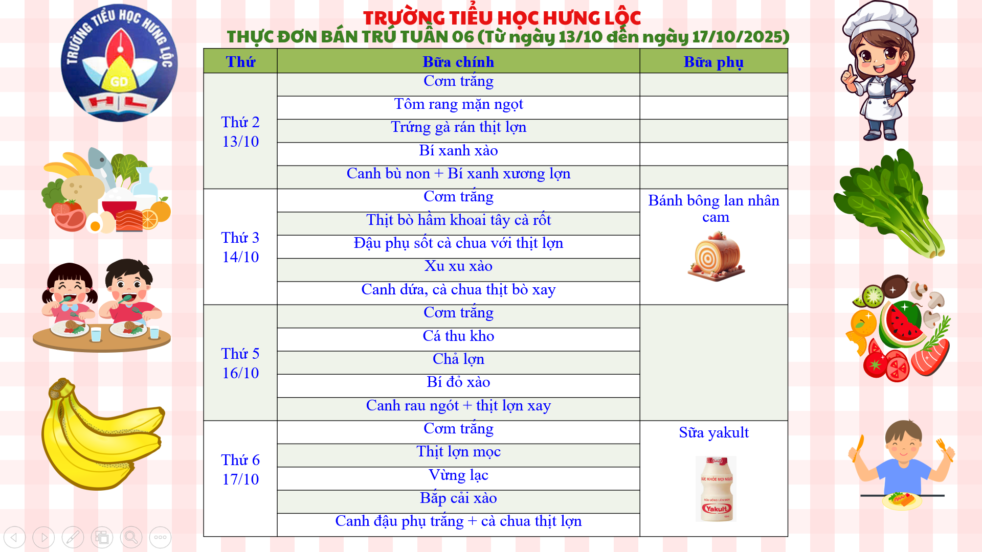 THỰC ĐƠN CỦA TRƯỜNG TIỂU HỌC HƯNG LỘC TUẦN 06 NĂM HỌC 2025-2026