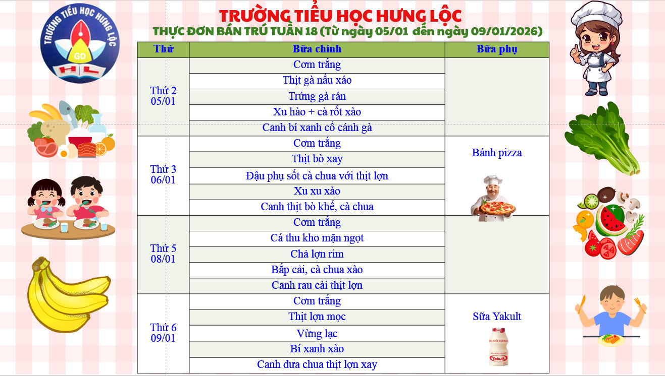 THỰC ĐƠN CỦA TRƯỜNG TIỂU HỌC HƯNG LỘC TUẦN 18 NĂM HỌC 2025-2026