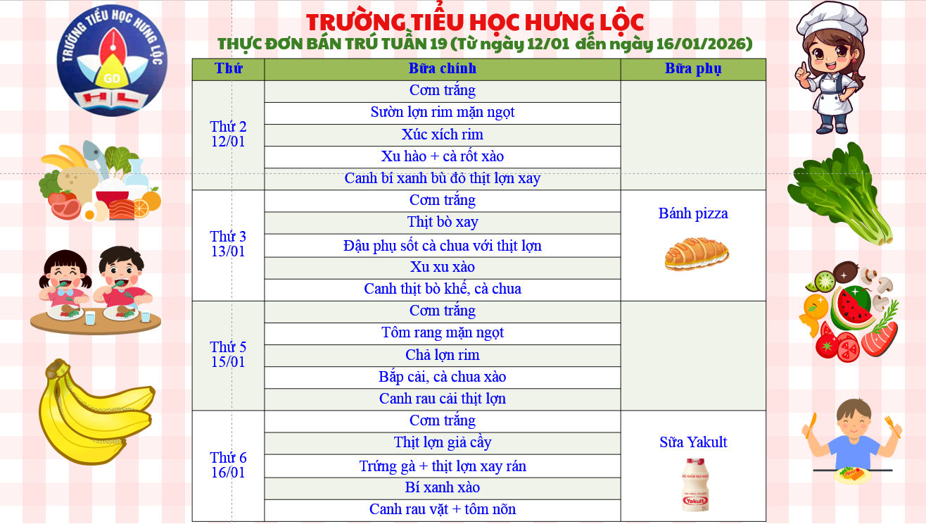 THỰC ĐƠN CỦA TRƯỜNG TIỂU HỌC HƯNG LỘC TUẦN 19 NĂM HỌC 2025-2026