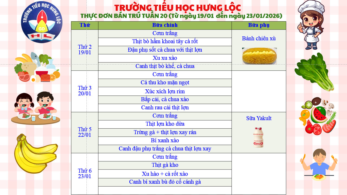 THỰC ĐƠN CỦA TRƯỜNG TIỂU HỌC HƯNG LỘC TUẦN 20 NĂM HỌC 2025-2026