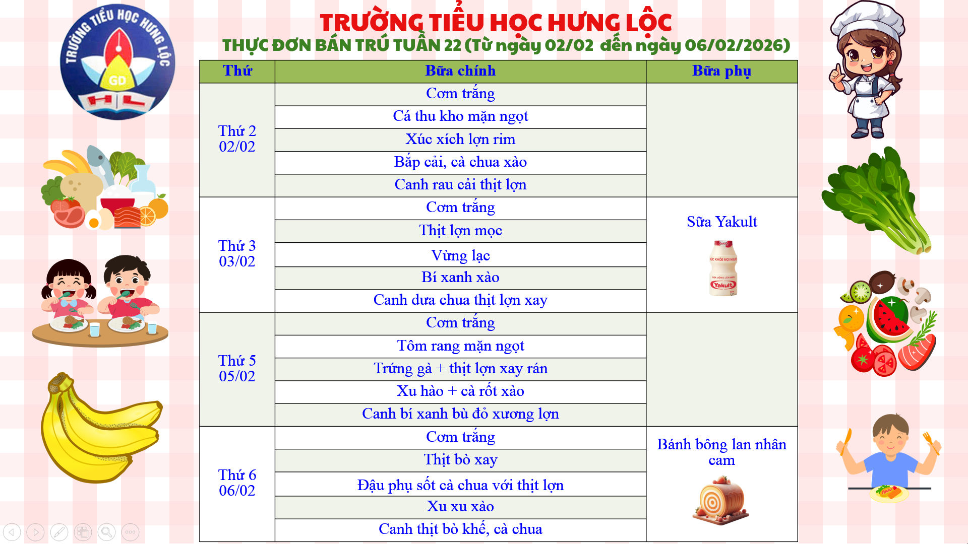 THỰC ĐƠN CỦA TRƯỜNG TIỂU HỌC HƯNG LỘC TUẦN 22 NĂM HỌC 2025-2026