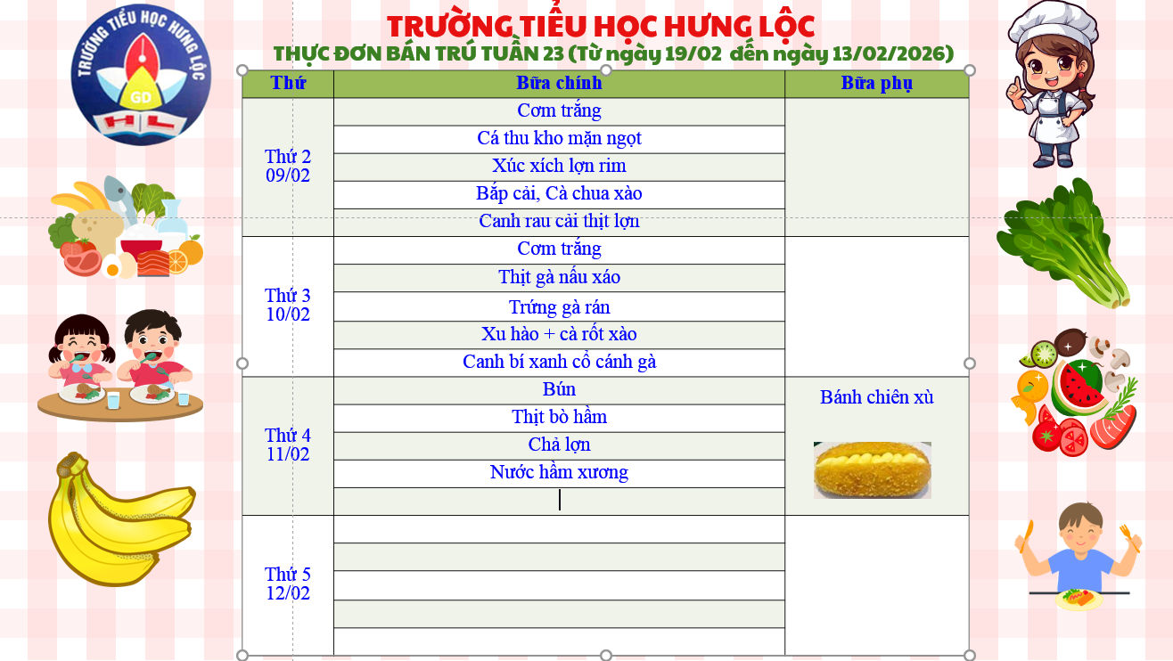 THỰC ĐƠN CỦA TRƯỜNG TIỂU HỌC HƯNG LỘC TUẦN 23 NĂM HỌC 2025-2026