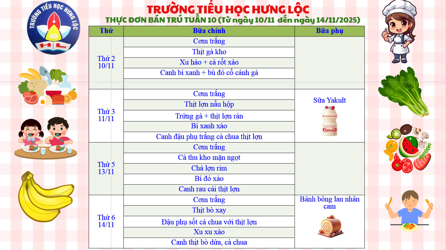 THỰC ĐƠN CỦA TRƯỜNG TIỂU HỌC HƯNG LỘC TUẦN 10 NĂM HỌC 2025-2026